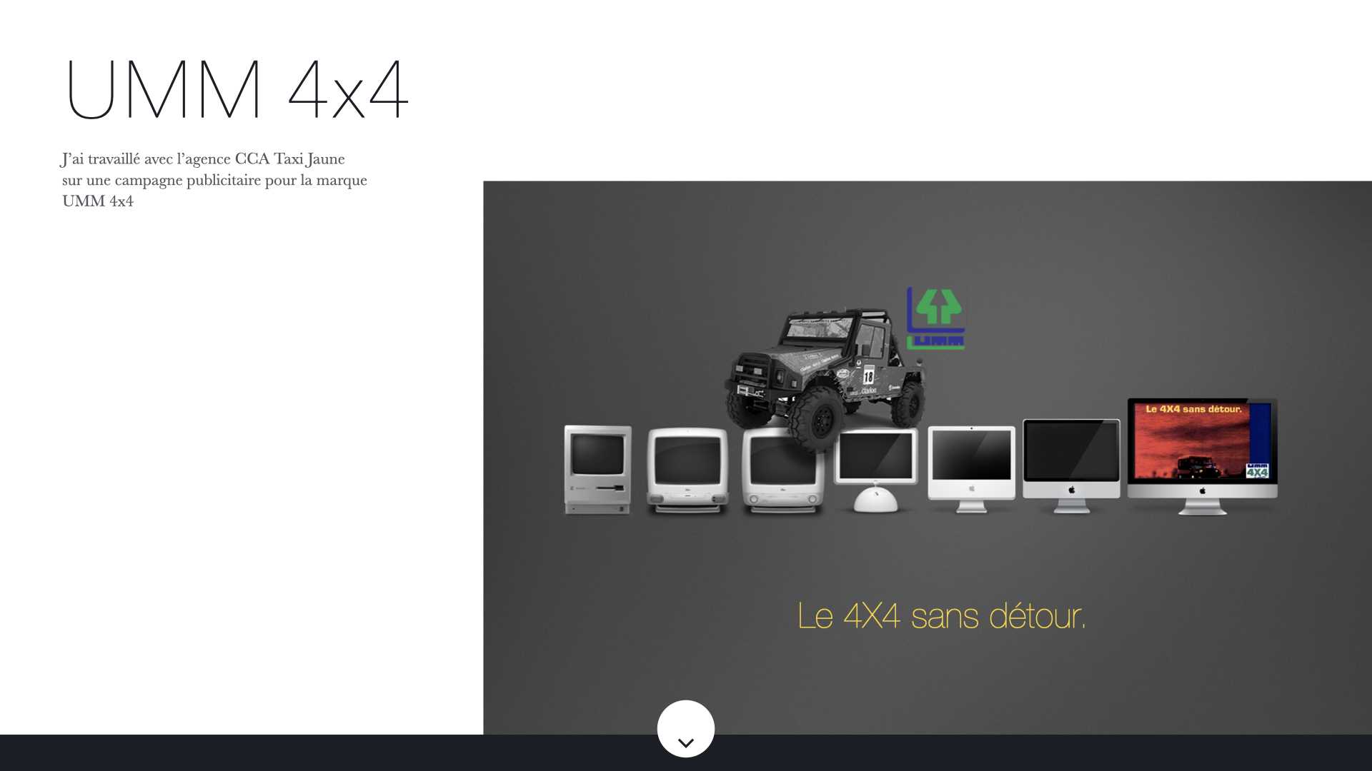 sur une campagne publicitaire pour la marque UMM 4x4, Le 4x4 sans détour.